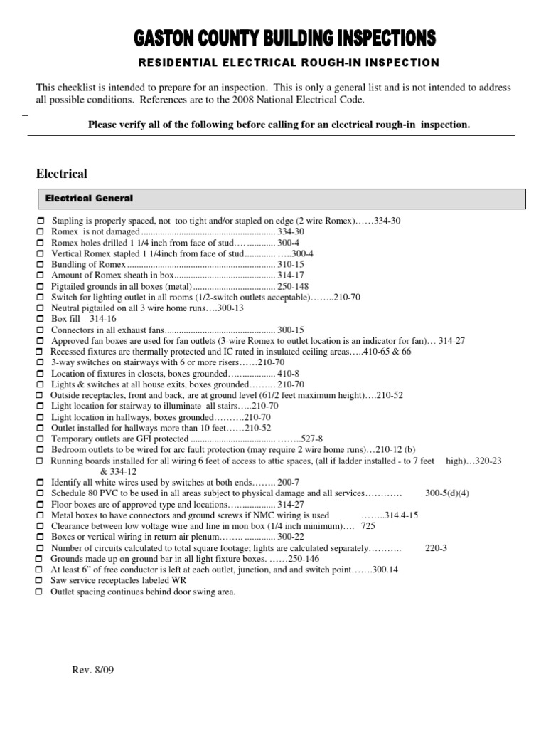 Electrical Rough In Checklist - This inspection checklist reflects code requirements of the 2015 international residential code (irc), the 2015 uniform plumbing code (upc), the 2014 national electrical code (nec), and the.